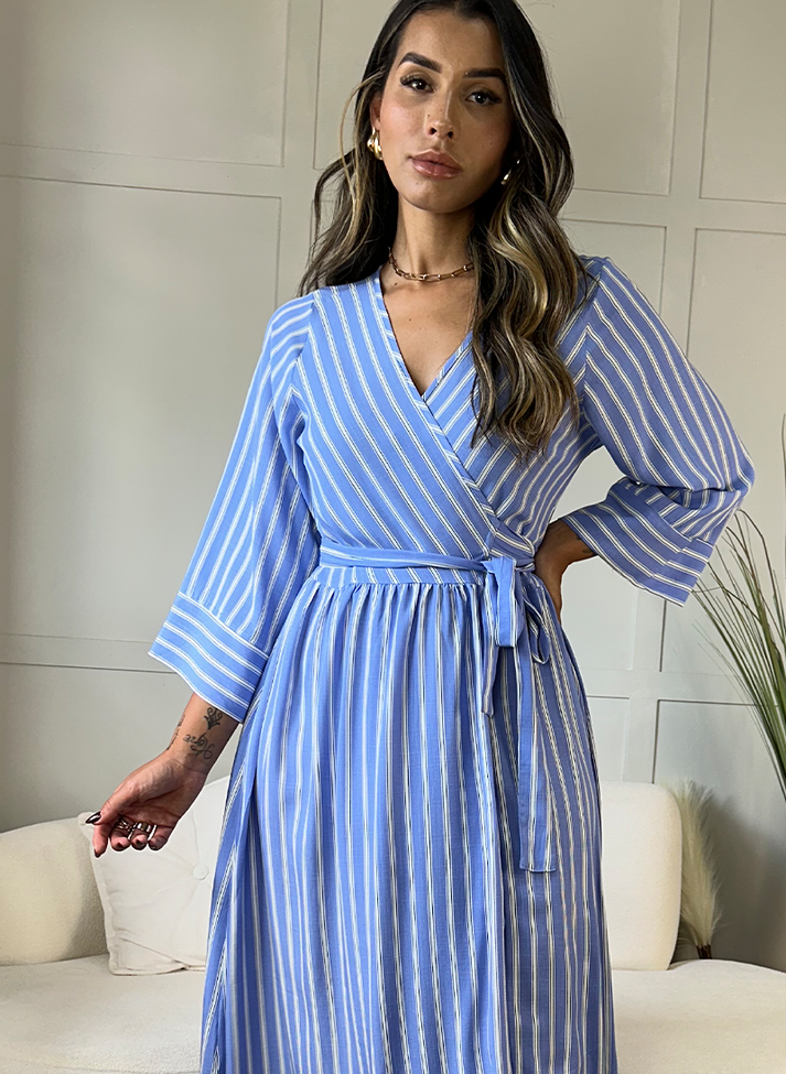 Vestido em viscose, tecido com caimento leve e toque macio. Possui estampa em listras, com jogo de sentidos em recortes. Modelo em comprimento mídi, transpassado, com modelagem mais ajustada na parte superior e saia franzida em evasê. O decote em “V” é formado pelo transpasse que finaliza em amarração de faixas na lateral, trazendo um toque de romantismo e feminilidade. As mangas mais soltas em comprimento ¾ possuem barra em pala larga com listras em sentido oposto destacando o recorte.